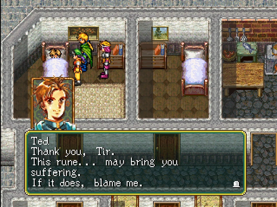 Сделал ещё полный пересказ сюжета игры на русском. Может, будет полезно для тех, кому играть не хочется, а сценарий заинтриговал. Часть 1: ВНИМАНИЕ: Спойлер! [ Нажмите, чтобы развернуть ][ Нажмите, чтобы скрыть ] ![]() История начинается во дворце Грегминстера — столицы Империи Алой Луны, — где аудиенции с императором Барбароссой Рагнером ждут генерал Тео МакДол и его сын Тир. В результате Тео получает приказ отправиться к северным границам, чтобы «уладить конфликт» с Союзом Городов-Государств Джоустона, а Тир, как ему полагается по возрасту и статусу, поступает на государственную службу. Вот только герой попадает под опеку Крейза Майлза — человека ничтожного и алчного, но Тео посчитал, что уж лучше так его сын будет пробиваться к верхам, чем никак.Далее МакДолы возвращаются домой в своё поместье, где свита, состоящая преимущественно из бывших солдат, ранее служивших под началом Тео и решивших остаться с ним и на гражданке, помогая по дому, уже заждались их. Особенно Гремио, который весь как на иголках был, переживая за Тира, и даже не заметил появления старшего МакДола. По случаю воссоединения семьи Гремио, умеющий бесподобно готовить, устроил большой пир. На следующий день Тео покидает столицу, а Тир вместе со всей своей свитой: Гремио, Клео, Тедом и Паном — отправляются на «работу», и первое задание, которое они получают от Крейза, — отправиться на остров, где живёт колдунья и звездочёт Лекнаат, и получить от неё свежий отчёт. Пан аж закипел, когда узнал, что ему придётся быть мальчиком на побегушках, в то время как остальная свита Тира осталась довольна, что первая их миссия по крайней мере не сулит больших опасностей. И чтобы путешествие было ещё более приятным и скоротечным, Крейз особенно слюбезничал и даже заказал для героев драконьего всадника, который как раз и переправит всех на остров. Иронично, что рыцарский орден со своей стороны также снарядил в столицу мелкого шкета, и получилась забавная ситуация, когда один новичок оказался нанят для работы с другими новичками. ![]() На острове герои «знакомятся» с учеником колдуньи Люком — своенравным и вредным мальцом, который насылает на героев голема. Оставшись довольным способностью команды Тира постоять за себя, Люк провожает всех к башне, где живёт Лекнаат. Тир получат от звездочёта бумаги со звёздными заключениями, и напоследок та предостерегает героя, что ему уготована очень тяжёлая судьба и что в жизни ему ещё предстоит хлебнуть немало горя, причём Лекнаат, способная видеть только общий поток будущего, не может сказать, каким будет итог всей той боли, через которую придётся пройти Тиру. Возвращаются герои далеко не в самом лучшем расположении духа, и Тир отдаёт звёздные заключения Крейзу, который ехидно замечает, что от какую-то пользу от него всё-таки можно выжать, и сразу же даёт новое поручение: отправиться в соседний город Рокленд и узнать, почему он тормозит с налогами. В процессе нам насильно навязывают Канаана — подмастерья Крейза, который только и умеет, как подгавкивать в такт своему хозяину, зато Тира и прочих даже за грязь не считает, т.к. они ниже его по званию. Герои прибывают на место, где узнают от местного чиновника, что виной всему являются разбойники, которые поселились в горах к востоку. Придётся их призвать к правопорядку. На подступах к разбойничьему стану на г