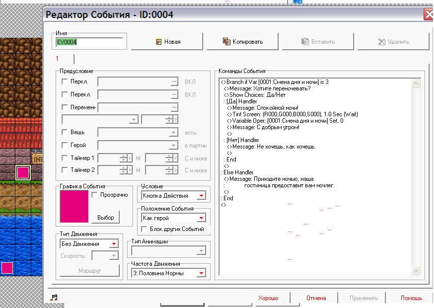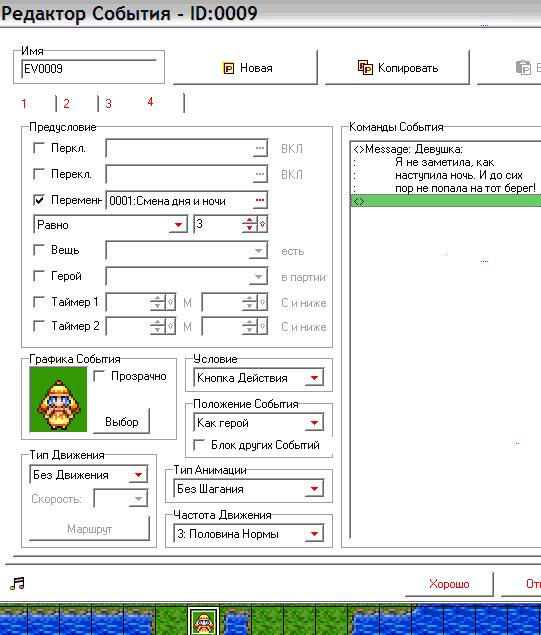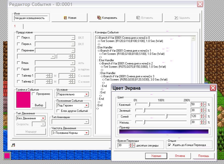 Этот волшебный ивент будет работать у нас как источник света, я назвала его «текущая освещенность». Мой способ смены дня и ночи предполагает, что на всех картах, на которых происходит смена дня и ночи, должен стоять такой вот подобный ивент из этого семейства. Конечно, ставим его невидимым, под героем, параллельно. Внутри проверяем значения переменной с помощью ветвления. Если у нас значение переменной равно 0, то это утро – ставим освещенность яркую, Иначе - если 1, то день – нейтральная освещенность, Иначе, если 2, то вечер – начинает темнеть, Иначе, если 3, то ночь, ставим, чтобы было темно, как ночью.